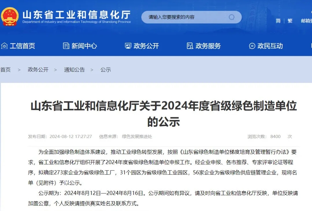 8月12日,省工信廳公示了2024年山東省綠色制造單位名單,山東金塔集團金塔科技公司入選山東省綠色供應鏈管理企業。